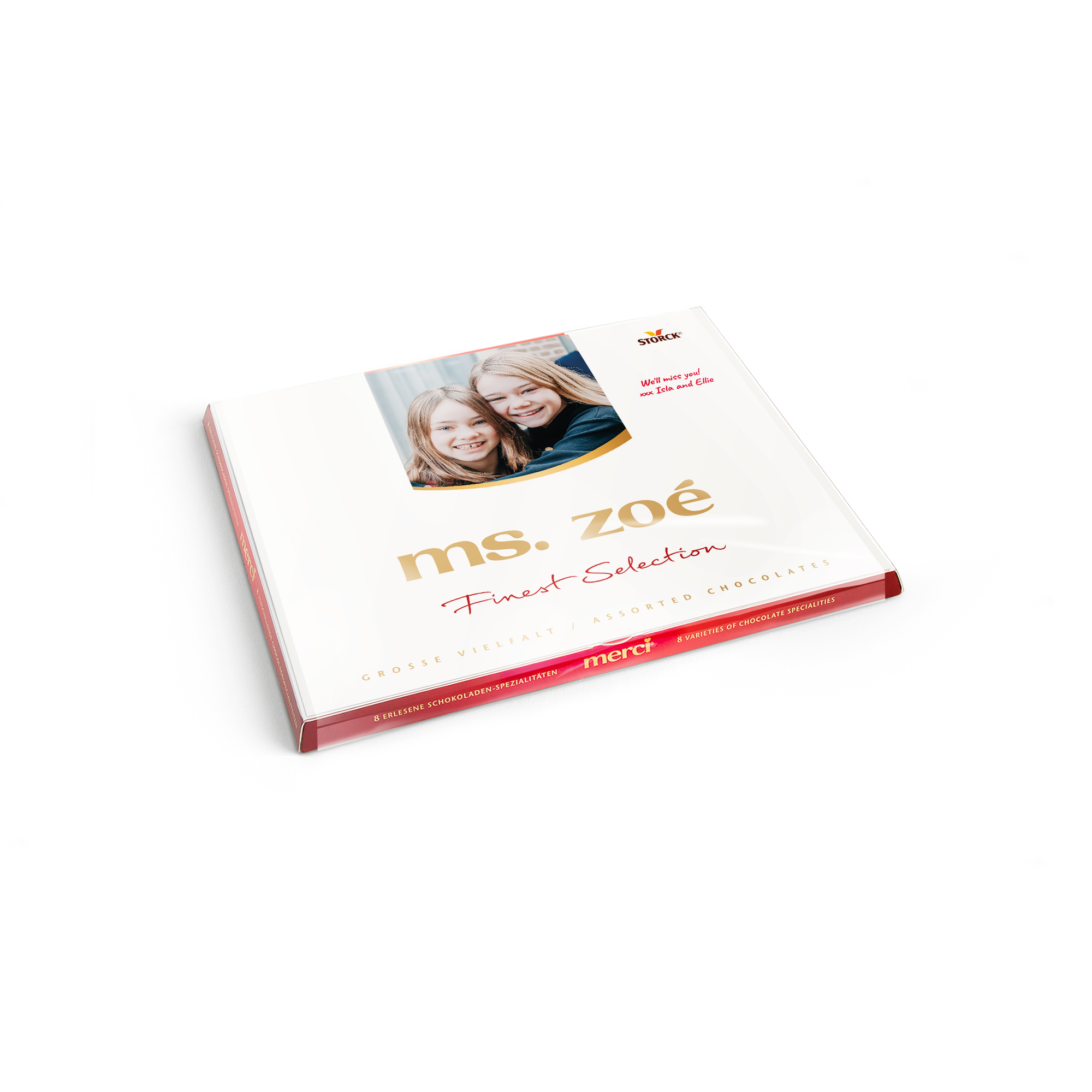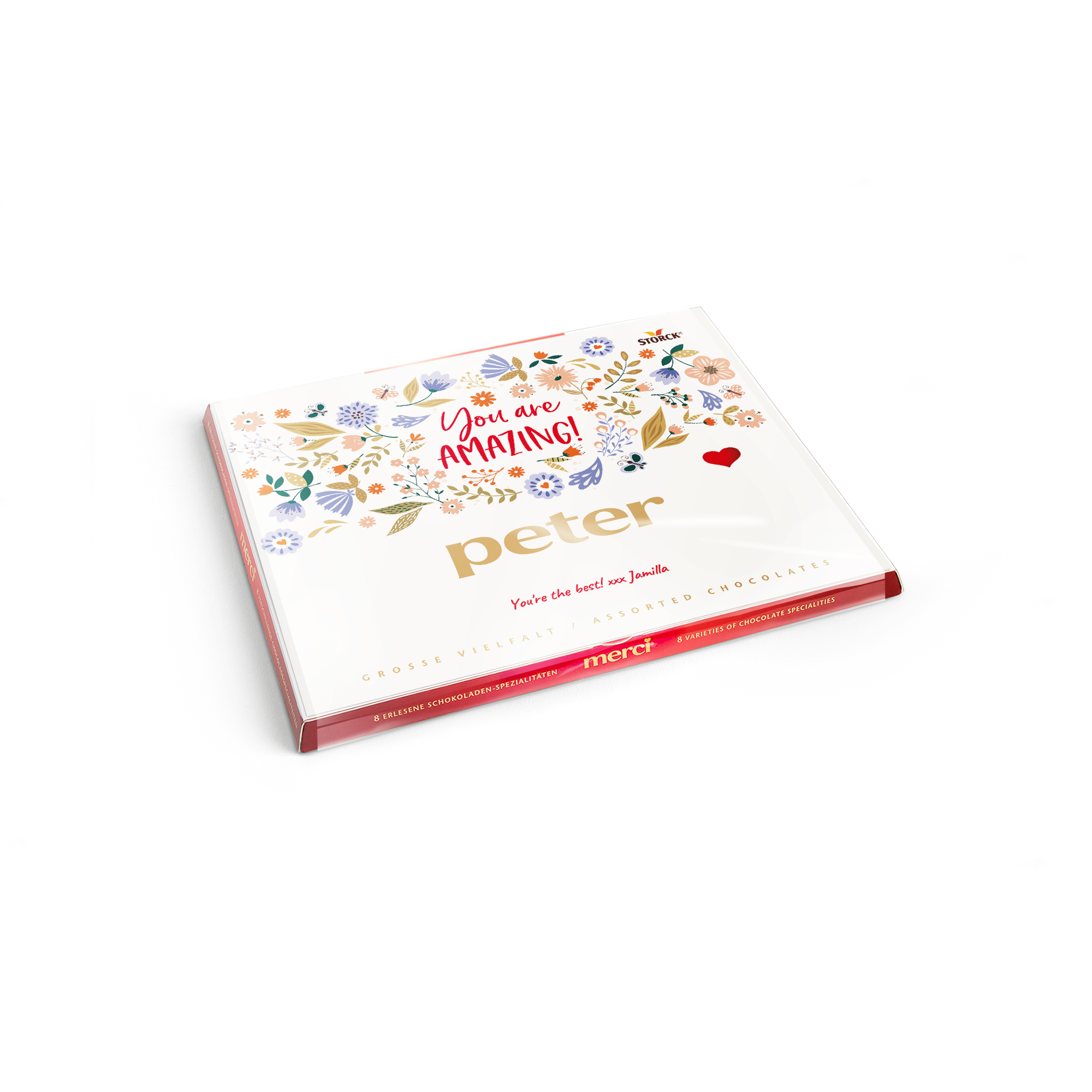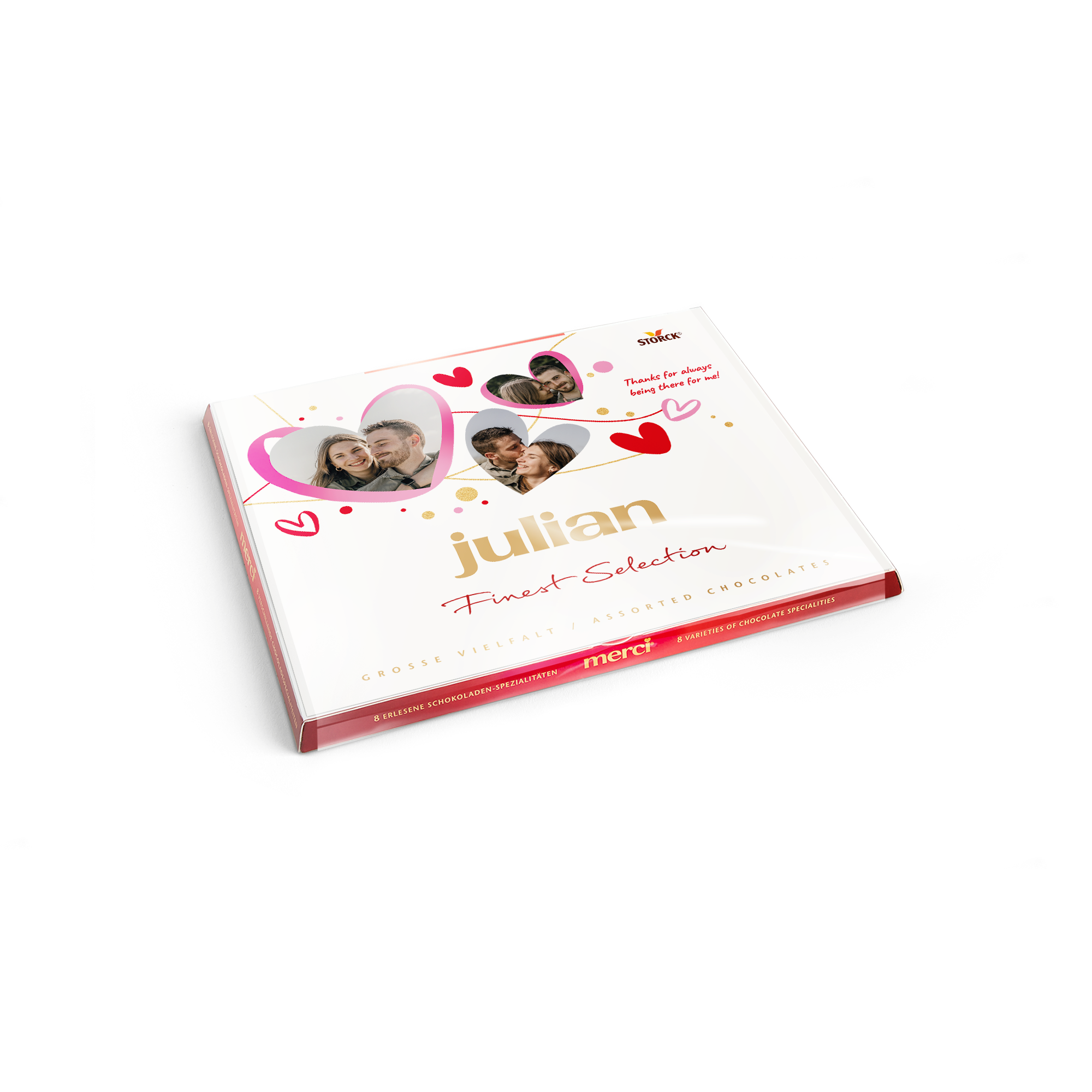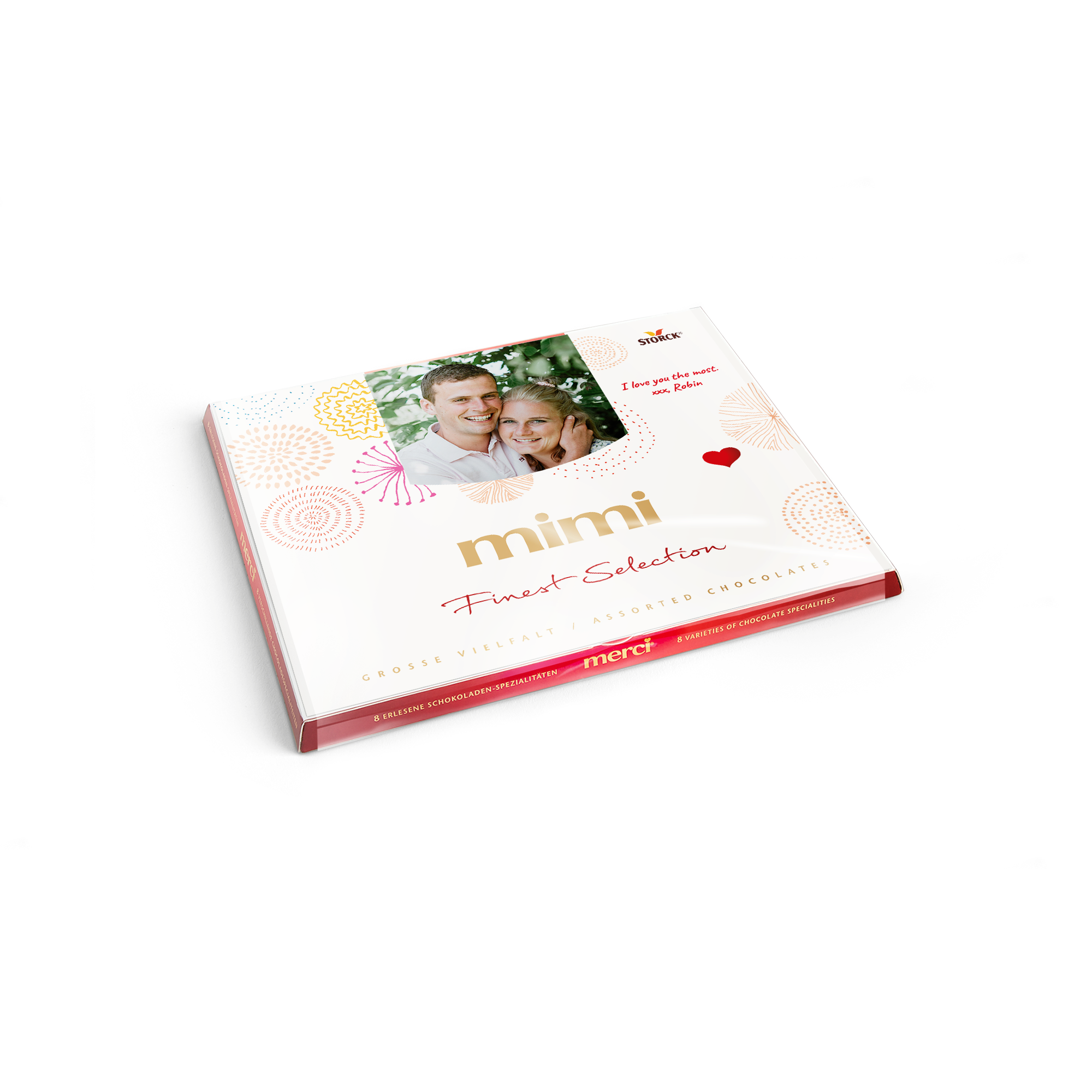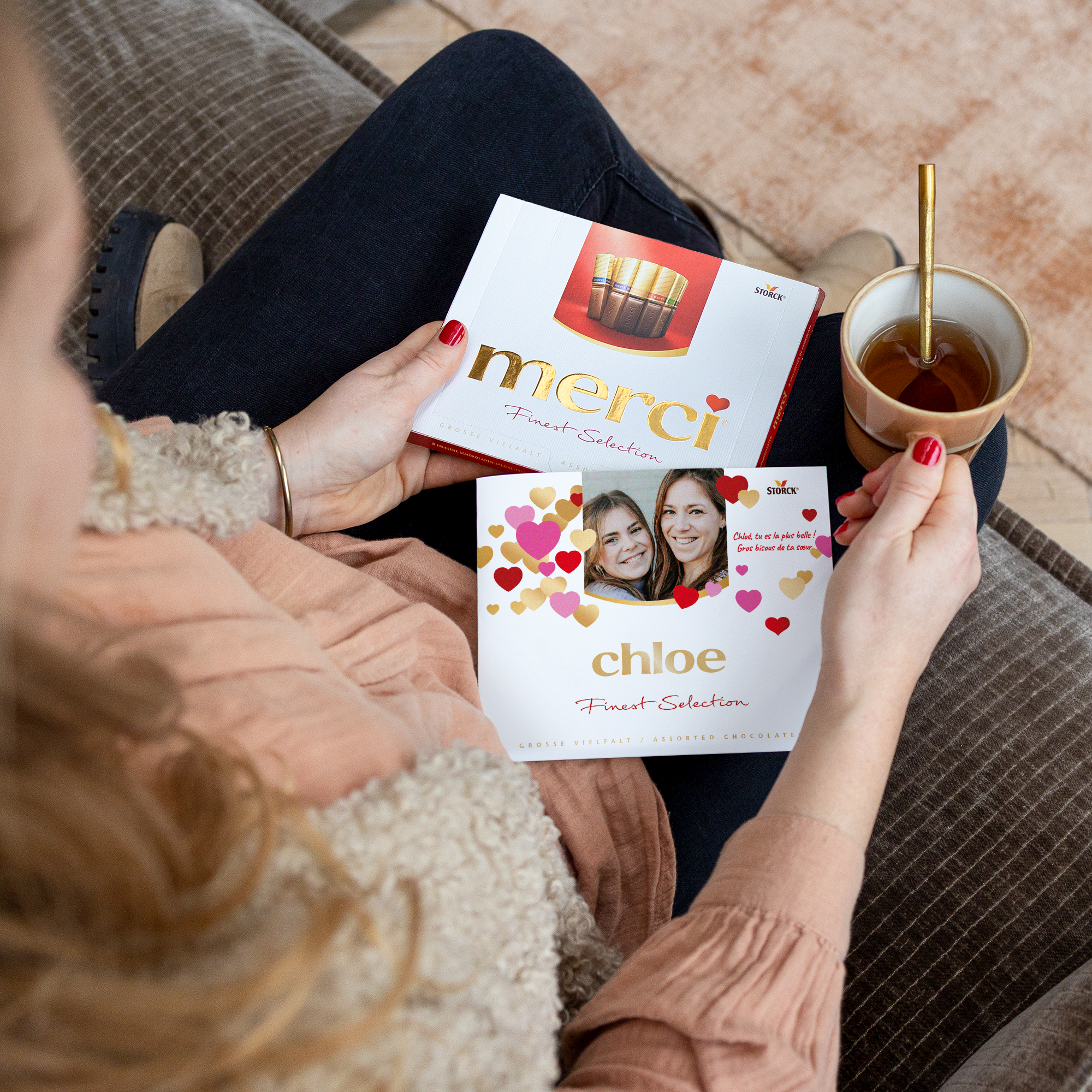 Коробка шоколада Merci с персонализированной карточкой с фотографией, именем и/или текстом по вашему выбору. Классический дизайн Merci!