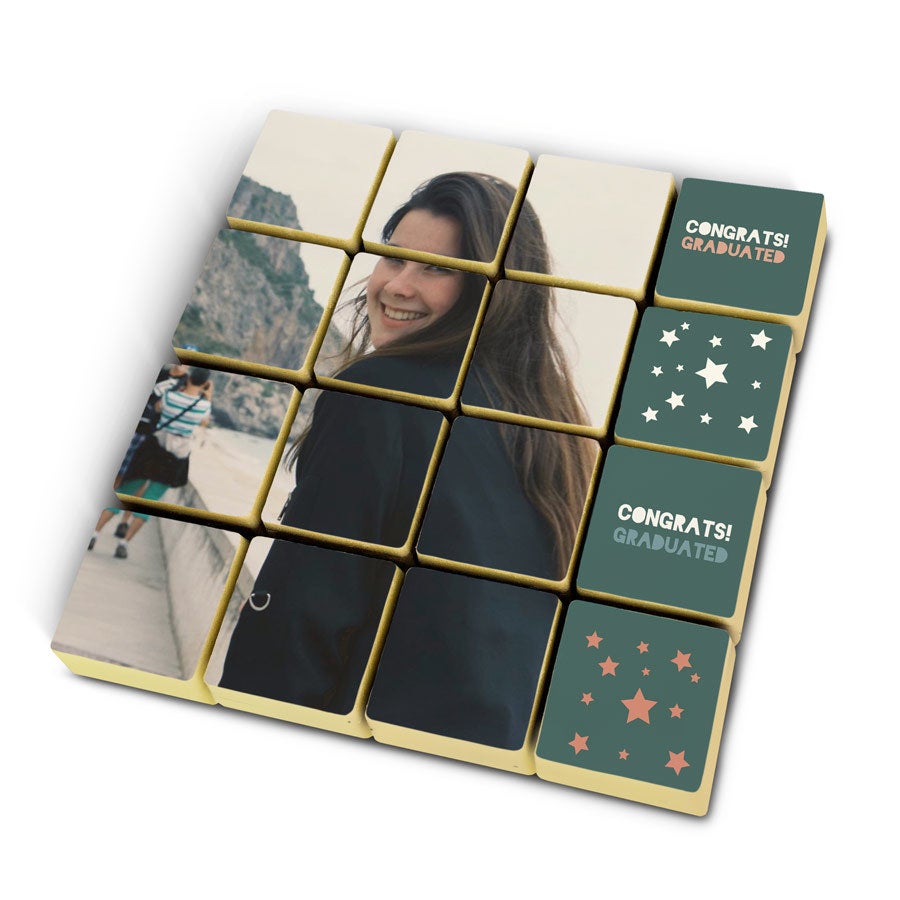 Дополнительная информация о фотографии шоколадных конфет:Количество: 16 конфетШоколад: молочный шоколад со слоем белого шоколада сверхуНачинка: пралинеРазмеры одной конфеты: 2,6 x 2,6 x 1,2 смРазмеры одного набора: 23 x 18 x 2,5 смПерсонализация: печать фотографии или логотипаПечать: съедобная печать в полном цветеПри температуре наружного воздуха 25 градусов Цельсия или выше мы не сможем гарантировать качество шоколада.Совет по хранению: Можно хранить до 10 недель в прохладном, темном месте при температуре от 14 до 18 °C. Информация об аллергенах: содержит сою, молоко и может содержать следы орехов и глютена. Состав: Шоколадные конфеты пралине с фундуковой начинкой и съедобной печатью: сахар, фундук, какао-масса, какао-масло, сухое цельное молоко, эмульгатор (соевый лецитин), натуральный ванильный ароматизатор. Съедобная печать: кукурузный крахмал, модифицированный крахмал: E1422, картофельный крахмал, вода, порошкообразный куриный белок, сухое обезжиренное молоко, оливковое масло, соль, увлажнитель E422, эмульгатор: E433, красители: E102, E110, E122: может отрицательно влиять на активность или концентрацию внимания у детей, E133, E151 Покрытие: E904
