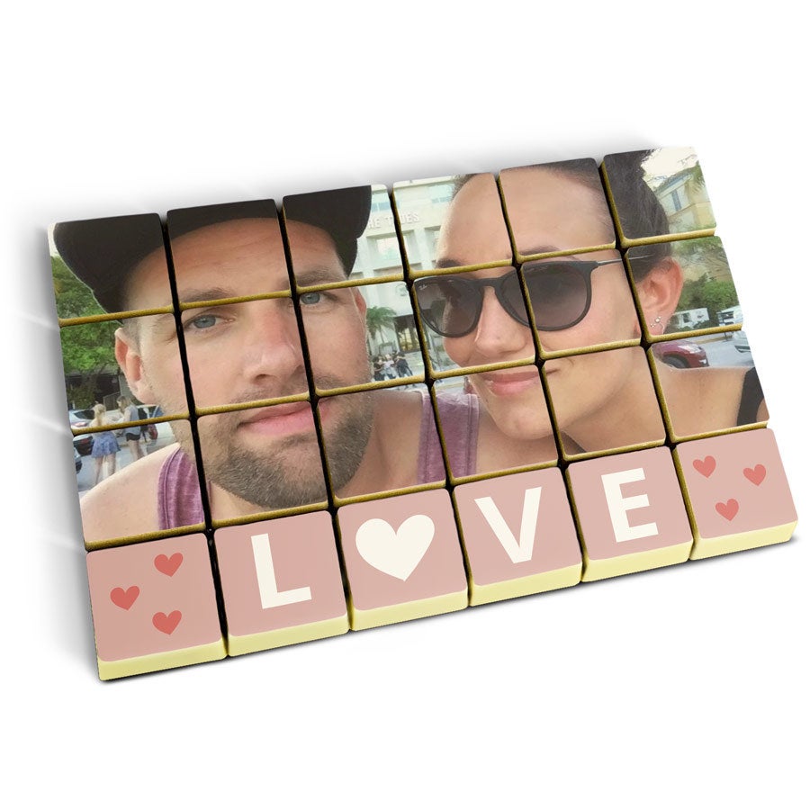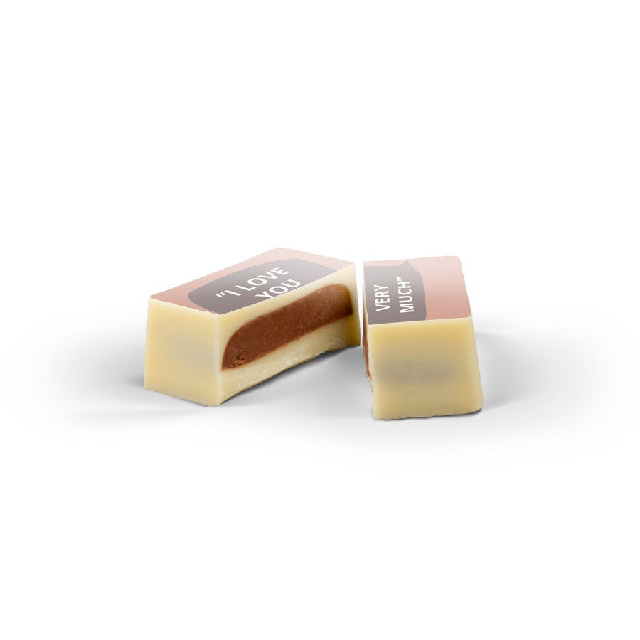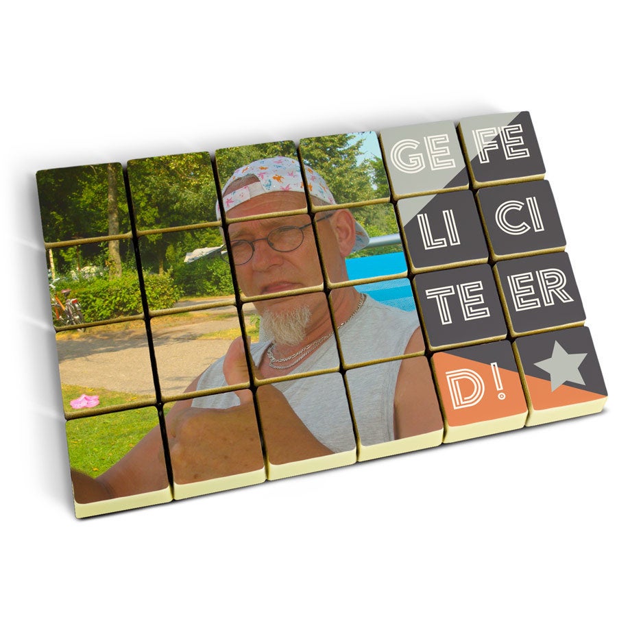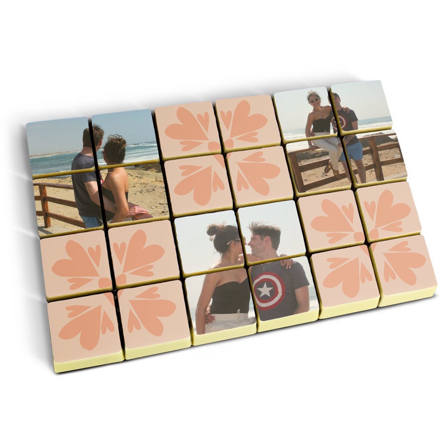 Дополнительная информация о фотографии шоколадных конфет:Количество: 24 шоколадкиШоколад: молочный шоколад со слоем белого шоколада сверхуНачинка: пралинеРазмеры одной конфеты: 2,6 x 2,6 x 1,2 смРазмеры набора: 23 x 18 x 2,5 смПерсонализация: печать фотографии или логотипаПечать: съедобная печать в полном цветеПри температуре наружного воздуха 25 градусов Цельсия или выше мы не сможем гарантировать качество шоколада.Совет по хранению: Можно хранить до 10 недель в прохладном, темном месте при температуре от 14 до 18 °C. Информация об аллергенах: содержит сою, молоко и может содержать следы орехов и глютена. Состав: шоколадные конфеты пралине с фундуковой начинкой и съедобной печатью: сахар, фундук, какао-масса, какао-масло, сухое цельное молоко, эмульгатор (соевый лецитин), натуральный ванильный ароматизатор. Съедобная печать: кукурузный крахмал, модифицированный крахмал: E1422, картофельный крахмал, вода, сухой куриный белок, сухое обезжиренное молоко, оливковое масло, соль, увлажнитель: E422, эмульгатор: E433, красители: E102, E110, E122: может отрицательно влиять на активность или концентрацию внимания у детей, E133, E151. Покрытие: E904.