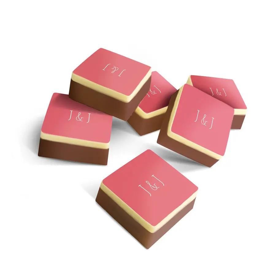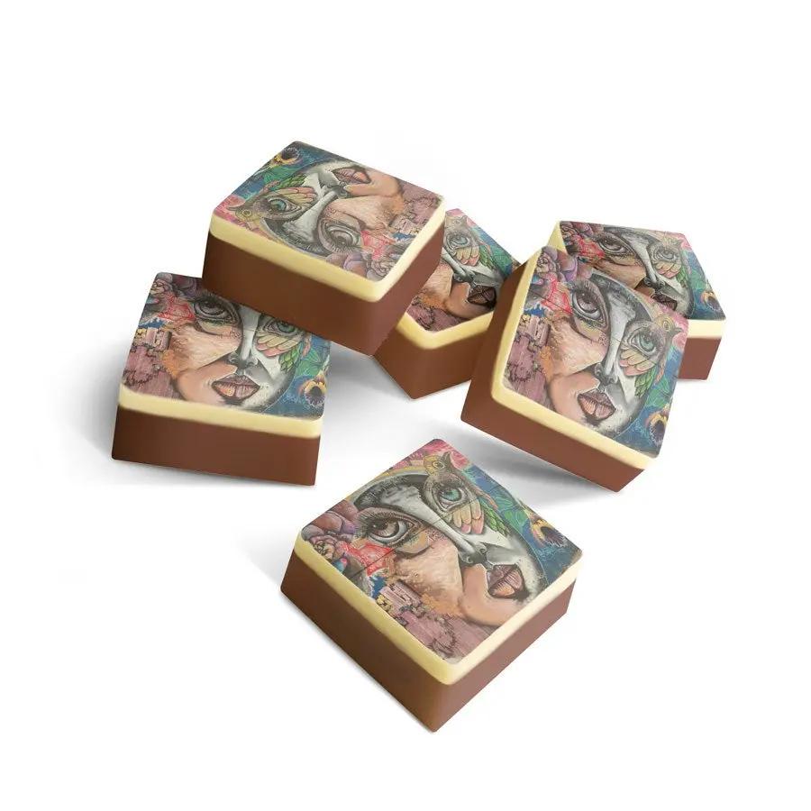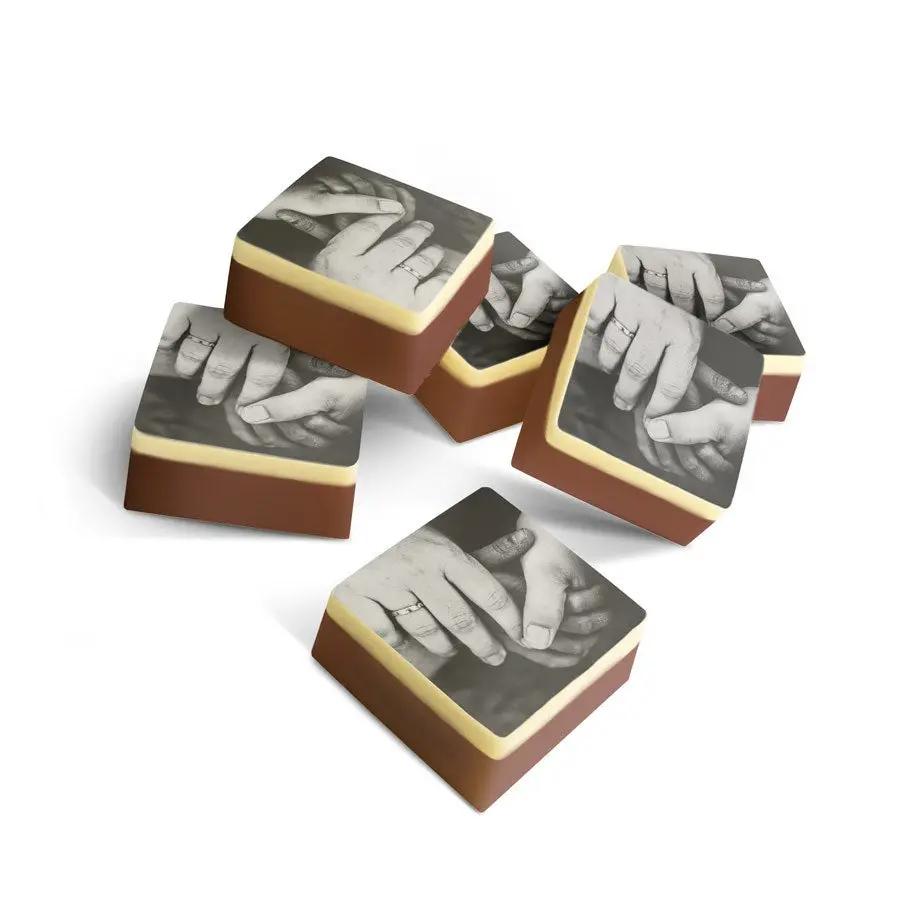 Набор из 24 квадратных шоколадок, молочный шоколад с белым шоколадом сверху, съедобная печать с фото или логотипом.