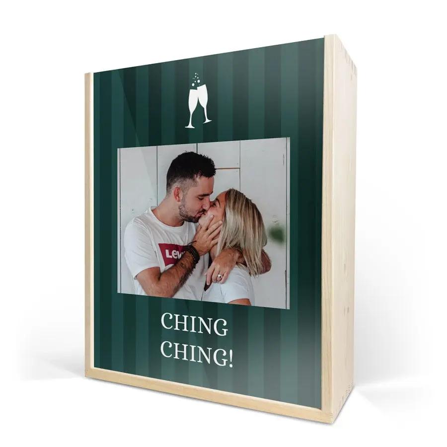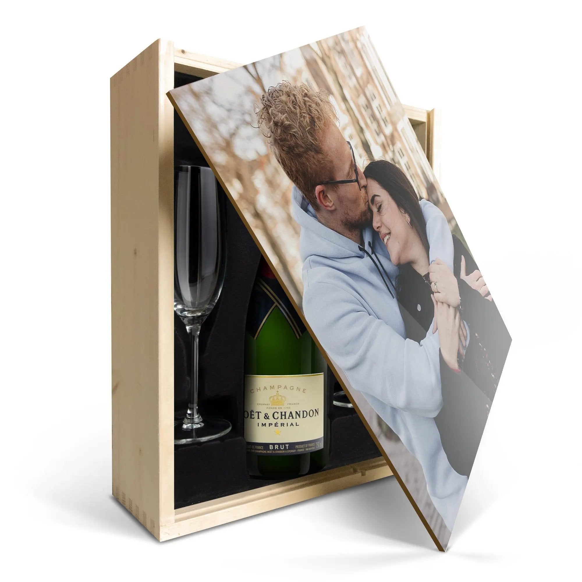 Изысканная бутылка шампанского Moët & Chandon с двумя бокалами. В роскошном именном деревянном футляре с вашим дизайном. За здоровье!